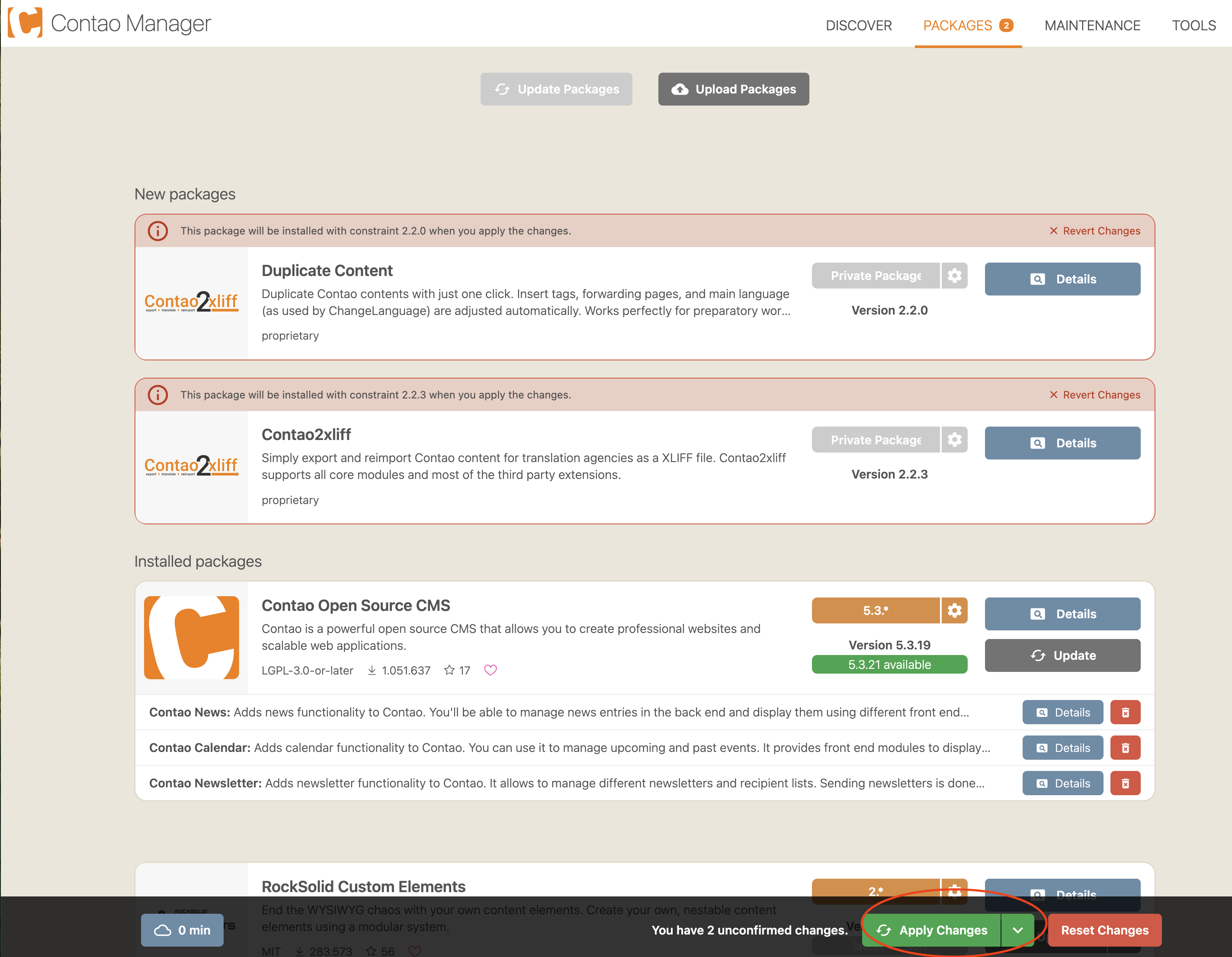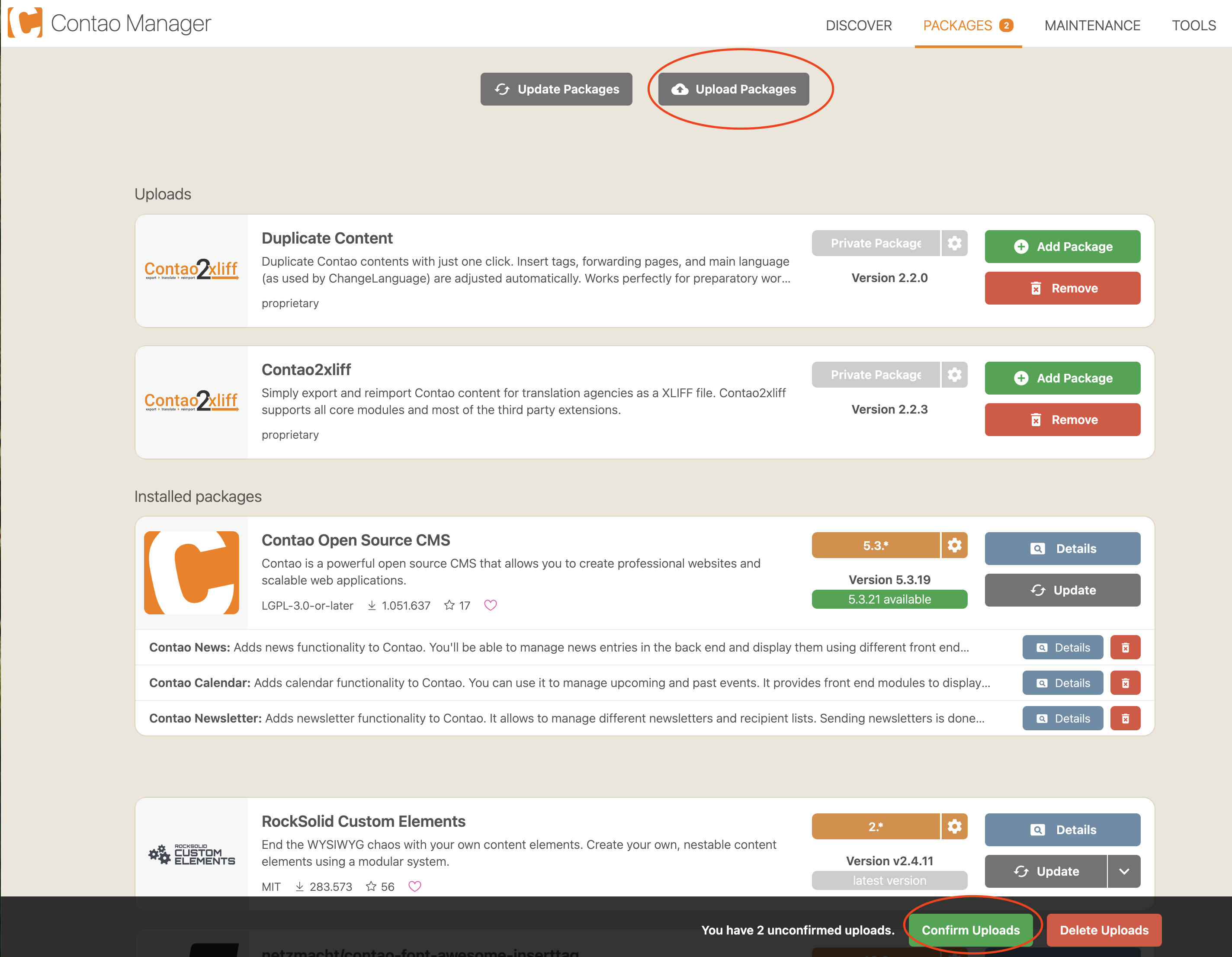 Das Paket Contao2xliff und Inhalte Duplizieren kann ganz einfach über den Contao-Manager installiert werden. Hierfür werden die erhaltenen Installationsdateien im zip-Format in der Paketverwaltung hochgeladen. Nach dem Bestätigen des Uploads kann das Paket ganz normal mit deem Contao-Manager installiert werden