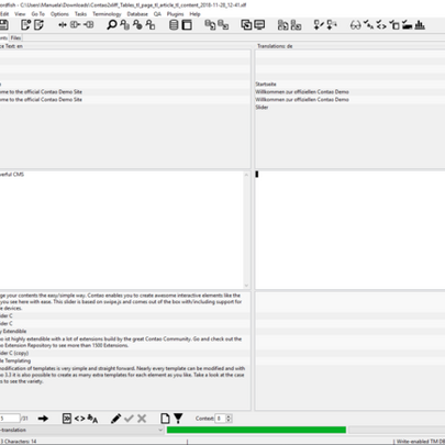 Die Übersetzung wird von der Software des Übersetzungsbüros in der Xliff-Datei unter <target></target> eingetragen. Beim Import schreibt Contao2Xliff die Übersetzung automatisch in die richtigen Datenbankfelder. Selbst bei großen Dateien dauert dies nur wenige Minuten.