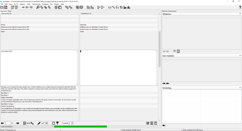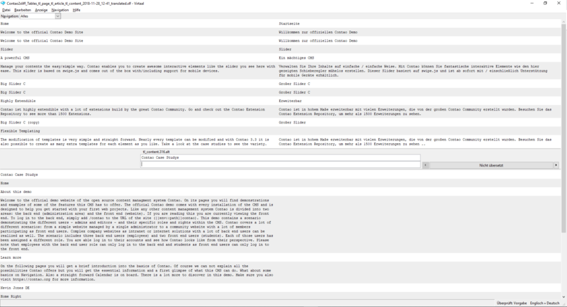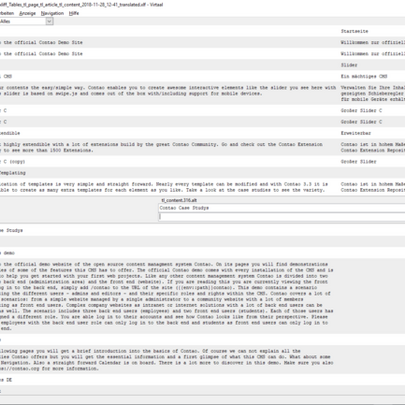 • stellen Sie sicher, das sie vor dem Exportieren der Xliff-Datei die zu übersetzenden Inhalte dupliziert haben (Contao2xliff überschreibt beim Importieren die Datenbankfelder)